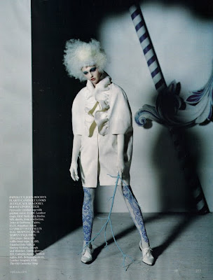 Assisted Shona on Tim Walker China White shoot for UK Vogue. We brought various elements from the famous blue and white willow pattern design to life, using dusters for giant catkins and paper plates for graphic leaves. We shot the story in a ball room in a psychiatric hospital in Romford which had been locked up for 50 years previous to the shoot. All kinds of things frozen in time were found - a half drunk pint that had turned to tar, the perfectly preserved skeleton of a mouse caught in a mousetrap, left to rot undisturbed.
